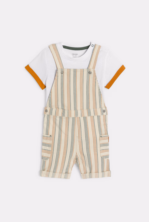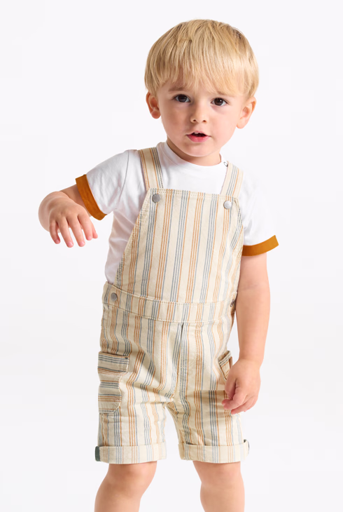Baby boy's brown striped short overalls and T-shirt