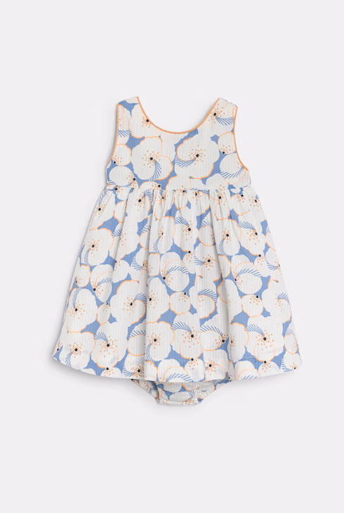 Baby girl's floral strappy pinafore dress and orange bloomers