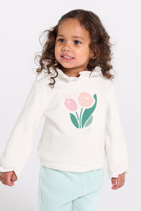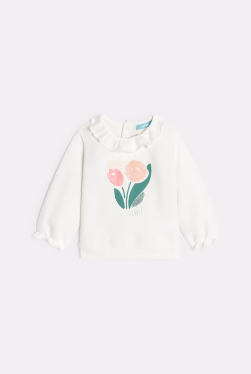 Baby girl's white floral motif sweatshirt with ruffle collar